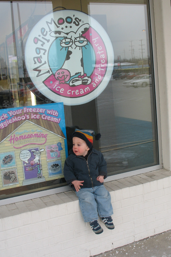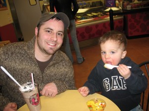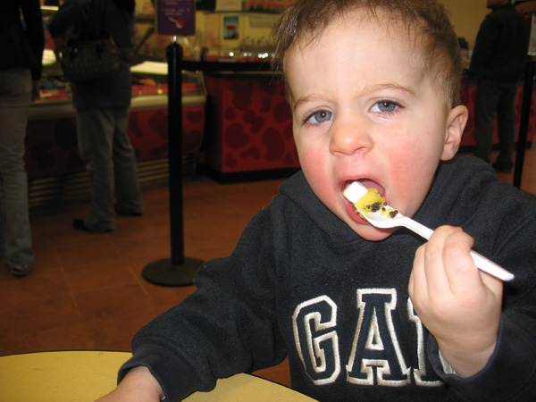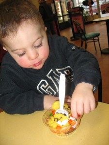 Porter and I met Ryan at Maggie Moo’s and Porter got to pick out his own ice cream and toppings. He wanted “Lellow” ice cream, so he chose the Mango Sherbert. He got marshmallows, chocolate sprinkles and “gummies” (mini gummy bears) on it. He was so proud of himself.