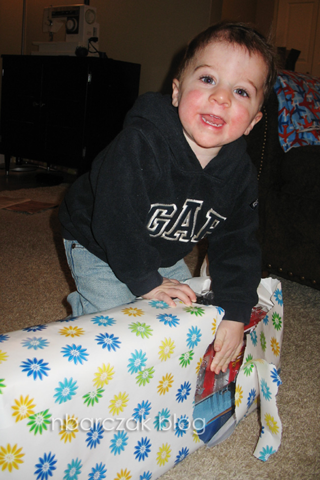 On the way home I told him I had a present for him at home to open. I figured he could open one of the three presents we got him on his birthday day. On the way home I asked him what he thought his present was. He’d say “Chocolate” or “Hummer truck” or other miscellaneous items he thought of. He was so excited to get a present, and even more excited that he got a fire truck!