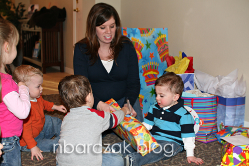 After cake we opened presents. Porter was pretty excited at first (although by the pictures, and his lack of smile, you’d think otherwise… I swear this kid DOES smile… he always looks bewildered in pictures HAHA!), but after opening a few trucks he was so over presents.