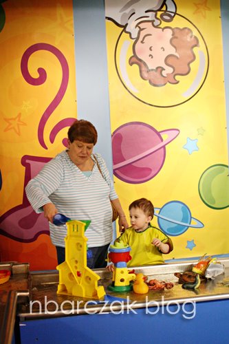 {Cathy and Porter playing in the water table in the Preschool Museum}