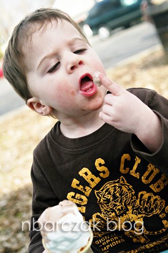When Porter got up from his nap we took a walk to TJ Freeze (yummy ice cream!) and on the way splashed in a puddle with his new “Trog Boots”. He is in love with these boots and they’ve been the footwear of choice since I brought them home on Thursday. He has been excited to jump in mud puddles since then, and we finally found one on the way to TJ Freeze.