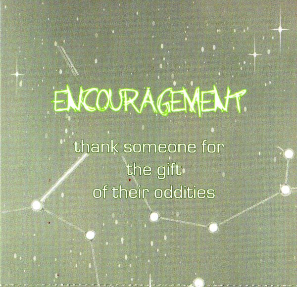 To kick off my attempt at a new, more positive outlook, I dug up these cards that I got from church awhile back. AWHILE back… like, before Christmas. When they handed out this card I thought about how cool it’d be to take their vision a little further and start something on my blog using a scanned image of the card. To occasionally throw out what Weswinds called “ENCOURAGEMENT- thank someone for the gift of their oddities.”