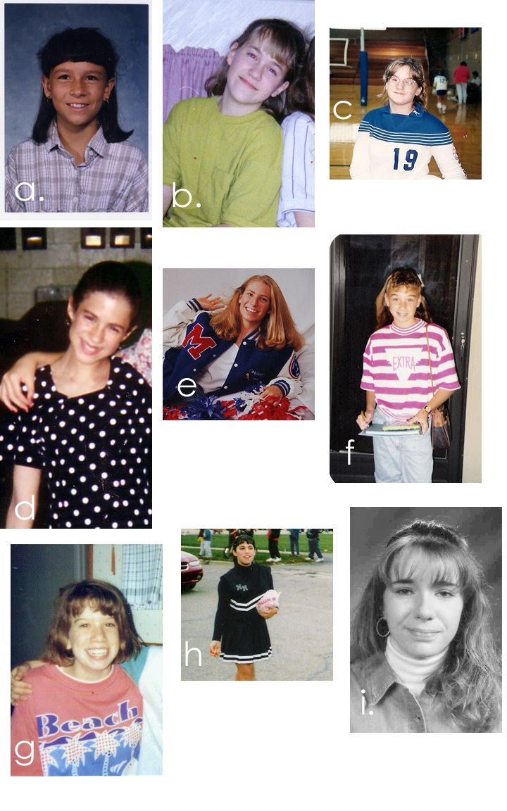 1. Mandi Haney – a2. Nicole – g3. Danette Schellhous – h4. Jenny Cook – c5. Carrie Cole – b6. Tracy Olson – i7. Kasey Laughlin – f8. Leslie Collins – d9. Cass Comerford – ei was having trouble with 3 and 6! we were all smokin’ nback in the day!