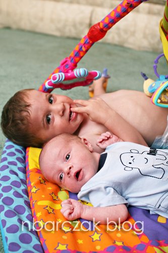 Here are a few pics of Hudson and his silly faces. And, of course, one of both boys. Porter likes to lay under the mat with him.
