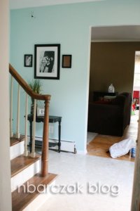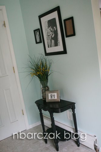 I’m still a little unsure of the color. I’m afraid with the black and white decorations it looks too… “modern” or “contemporary” even though the table is antique. I wish wish wish we didn’t have those icky marble floors (although I’m thankful its a neutral color and not something awful hideous) and that it was a nice dark wood floor (which is what is under the marble). I’m not sure of what kind of rug to put in there. I plan on painting the stair risers white and putting a coat of Dark Walnut stain on the top of the steps. I’ll probalby put different decorations on the table- I just threw those there for the time being.