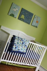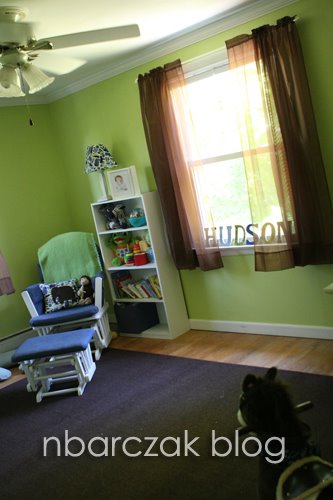 Hudson’s room… the ceiling was a grayish tan and the walls were sage green. Painted them both and I *love* the color of Hudson’s room (Sublime Lime from Pittsburgh Paints). The color isn’t as neon as it looks in the first few pictures. Its more true to the last picture of his crib and paintings.