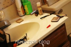 I get to the top of the stairs and see my powder brush and foundation brush laying on the bathroom floor… matted with white gunk. I peer into the bathroom… it looks a little messy, but I hadn’t picked up from getting ready that morning so nothing was that out of place. The bottle of hair paste was nowhere in sight. That made me nervous.