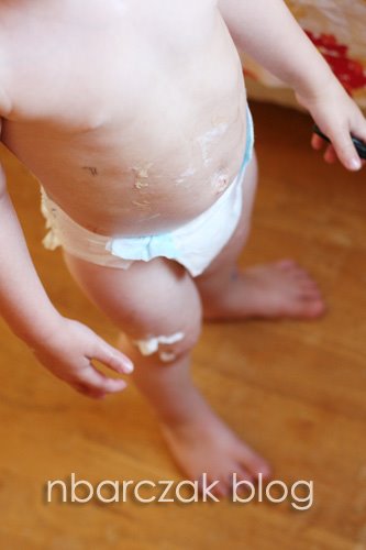 He looks at me, grinning… “HellllOOO Mommy!” in his most chipper, optimistic voice (probalby hoping I wouldn’t notice the goo smeared all over his belly, face and leg). I assessed the situation, peered closer to try to identify the goo all over him. Was it baby lotion? Was it Nystatin cream? Shampoo? Or… quite possibly… the new hair product that is thick and gooey and glue-like. Yep. That’s it. And it appears that there is a smear of foundation near his belly button. Oh holy hell, what am I going to find upstairs.