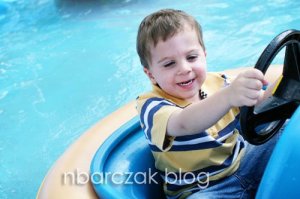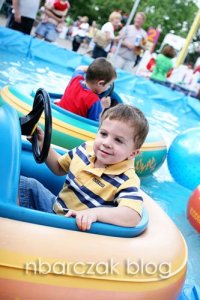 When we drove up, he kept saying “I wanna go in there!” When we got inside he was awed by the rides and everything going on. He wanted to ride this upside down around a track ride (for adults)- HAHA! We did let him pick out one ride (tickets were 4/$5… and each ride was 3 or 4 tickets!) and he chose the Bumper Boats. This ride was so cute! All these little steerable raft boats in this knee deep pool of water. Fun stuff!