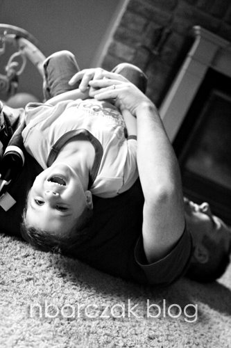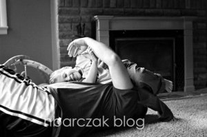 Hudson… oh Hudson. He went about a week and a half of sleeping through the night- about 8pm to 7am… but the past few nights he’s been up around 3am for a bottle. Grr. Other than that he’s still the same ol’ ball of grinning drool. He’s been drooling a ton for the past few weeks, and chewing on everything. Not sure if he’s teething (isn’t this early? P didn’t get a tooth till 5.5 months old) or what.