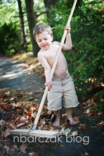 Fall is obviously just around the corner… the tree in our front yard is already beginning to turn colors and fall! We spent a little time sweeping our driveway (we have a couple pine trees along one side which is kind of annoying, although the shade is welcomed!). Porter kept calling it “hay”. Here he is, raking the hay.