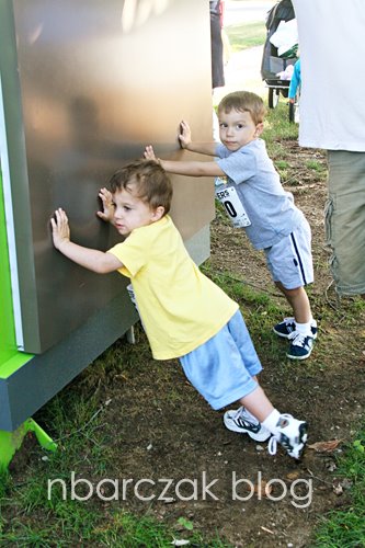 By the time it was race time he was falling fast. He whined about his number being pinned on. Wanted to carry his flipping helmet, wanted to be carried… the works. I finally tried to get him excited about the race, tried to get him into stretching with me (which he was having fun doing before my race) and once we lined up for the run he was only interested in the freaking fire truck, which was parked BEHIND the start line.