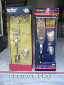 The screen door handle on the front door is also broken. It works, but pieces are missing and it has parts that are all jiggly and loose. And, they’re bright brass, which I really dislike. So, we are using our garage sale money to buy new door knobs.