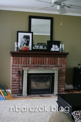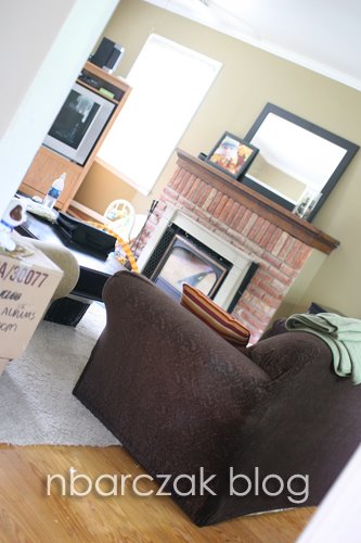 The couch faces the fireplace. Originally I had this big mirror propped up horizontally (like this:)