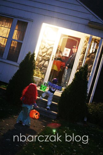 The neighborhood we went to was hit or miss… it seemed like every third house had their light on, which kind of made for long walks with the two little kids. (I was thinking though that its kind of a transient neighborhood and maybe people in that neighborhood are getting hit hard by the economy/loss of job and just didn’t have money to pass out candy. Candy is expensive!!) Maybe next year we’ll try another neighborhood.