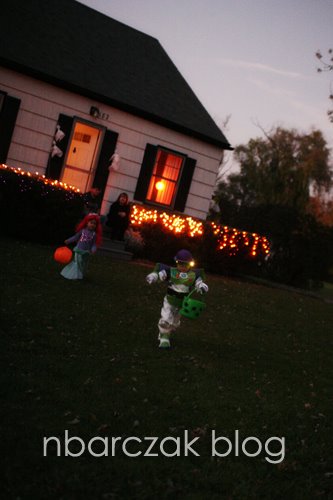We loaded the kids up in the wagon (Heather, Ryan and I took P and A… we left Hudson at home with Ryan’s dad) and walked through the high school parking lot to the little neighborhood up there. (Our road doesn’t really pass out candy- no one comes down our road). Everyone was laughing at Porter’s costume… “AWW! Look at the little Buzz Lightyear!” chuckle chuckle. I do have to admit, he was so cute and funny looking with his little wings and his space cap on HAAH! He and Aubri were so darn cute running up to the houses. Aubri, who is Miss Slowpoke was going SO fast and actually beating Porter up to some of the houses. She doesn’t get candy that often and she was on a mission to score some major loot tonight! They did a great job yelling “TRICK OR TREAT” and saying “Thank you” afterwards. They went up to most of the houses themselves while we stood back near the road. It was adorable to watch.