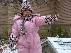 This is one of the pictures my mom showed me when I went to pick the boys up. Porter wanted to play in the snow and she just happened to have this Pink Nightmare of a snowsuit she had bought a few years ago for Aubri. Oh boy…