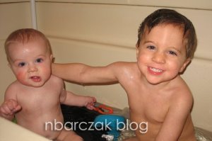 Porter liked pouring water on Hudson’s head. And then he saw Hudson pee in the bath and guess who thought it’d be fun to “pee on his pee.” Oh gross….