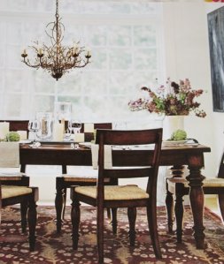 The dining room…ohhh the dining room. Originally I’ve been set on doing the walls a dark grayish green with a chairrail and flat paneled wainscoting below but I kind of freaked out on the color… especially since we’re not doing the wainscoting/paneling quite yet. So… I went with a creamy ochre/beige/almond color. And if you know me well enough… this is SOOO not me to go with such an… off-white color. However, I’m inspired by this dining room from Pottery Barn… I’m drooling over this table and chair set, and hopefully will own it someday (must start saving my money!). I found a rug that is similar to this at Menards- special order- and I am thinking soon I’ll purchase that. So… my idea is to have light and airy walls, and let the darks be grounded in the wall decorations, the furniture pieces and the rug/table settings. I plan to buy an old dresser and paint/distress it for one wall and get a large canvas artwork for above it.