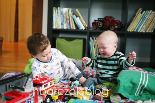 The playroom is this great light greenish shade… similar to Hudson’s room but not as bright. Its perfect for being right off the living room. I’m going to do a ledge around the room like this one found in the Ikea catalog… and put different colored frames on the ledge with drawings from Porter. He’s just beginning to do adorable drawings of people/things and it cracks me up.