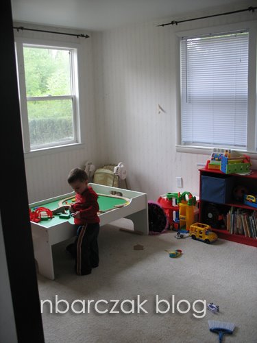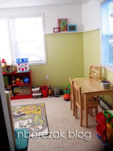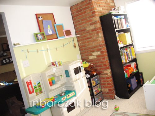 It looks great!! We just cleared an area for a playroom in our basement for Grace and I am now embarassed to post pictures of our hodge podge room 🙂 I love the green paint color and the places to hang artwork!!