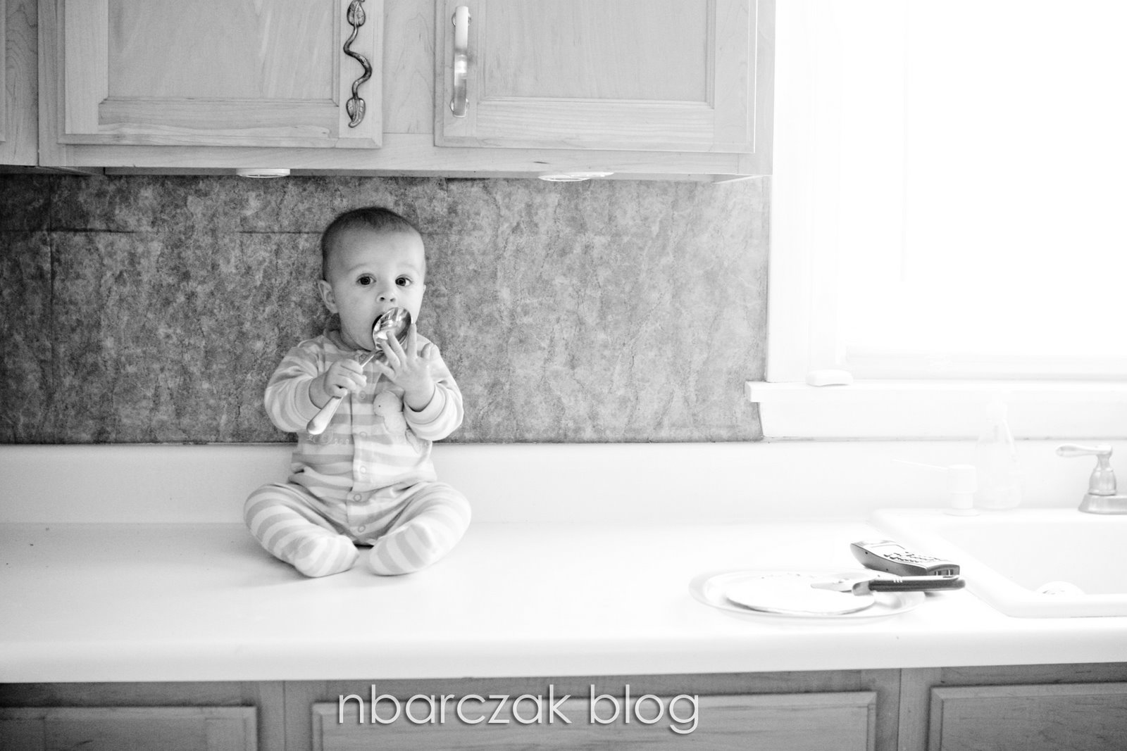 1. The bedroom is looking good!… love that bedding.That pic of H on the kitchen counter is adorable.And I see you still haven’t decided on your cupboard handles. haha!