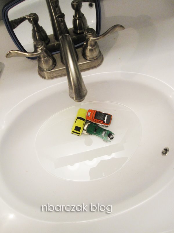 You know there are boys in my house….. Porter’s “pond” as he says. As of late he’s been refusing to sleep in his room/bed. He wants to sleep in the guest room (or… “gas room” as he calls it HAHA). Whatever… that’s where he’s been sleeping. The Gas Room it is. After he was long asleep, Ryan called me upstairs to see something. He found this in the bathroom…. Porter must have been up dinking around before falling asleep. His trucks… in his “pond”.