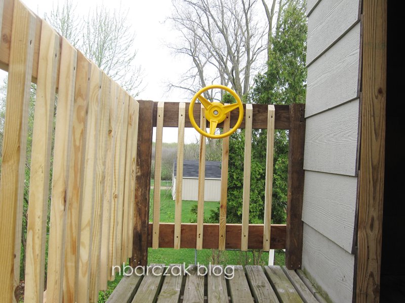 Here is the “before” picture… how it looked when we moved in (minus all the bee hives and wasp nests inside):The deck is 7ft in the air. Not all that safe for little kiddos to play on. #1 mission was to put up a railing. We got that done earlier this week… a one evening project. Voila!