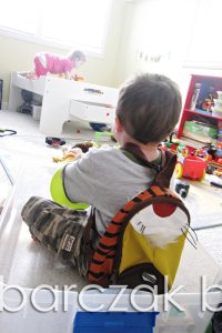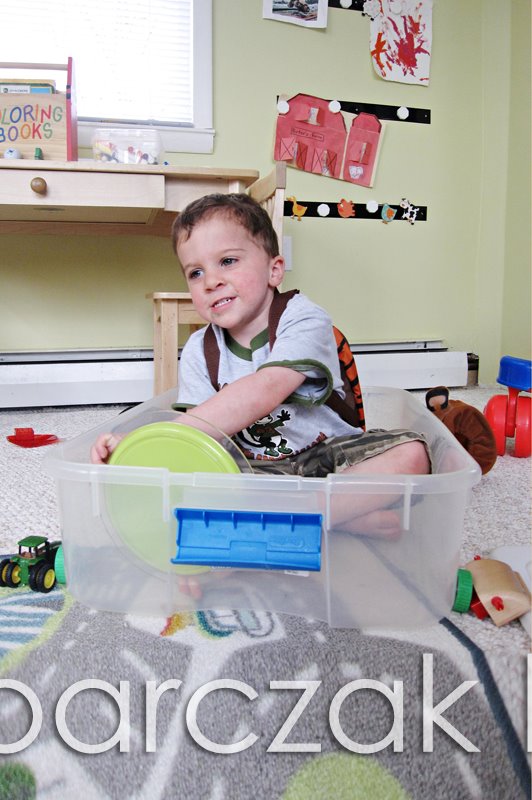 Look closer. Yes, he’s sitting in the bin… his “bus”… yes he’s using a plate for a steering wheel. Notice the buses’ wheels…. he took apart his big Automoblox truck and placed the wheels around his “bus”. Only, they wouldn’t stay up that well so he used objects like… his hat, his tiger puppet and parts of the Automoblox to hold the wheels in place.