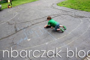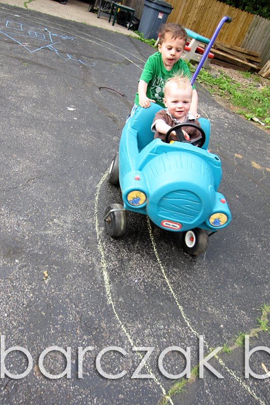 I helped Porter draw a road in the driveway, complete with houses for the boys and driveways next to their houses.
