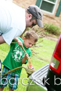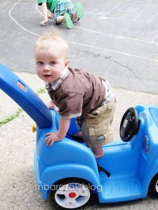 After the bushes were out and cleaned up we grilled out and the boys played. Hudson got daring! He had been trying, and succeeding, at climbing onto his ride-on toys all afternoon. He decided to get daring and stand up on his car!