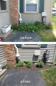 This other little area is on the side of our house by our driveway. I was a mess of weeds when we moved in. It now has some sedum, a mum and some othe rplant that I’m not sure of.
