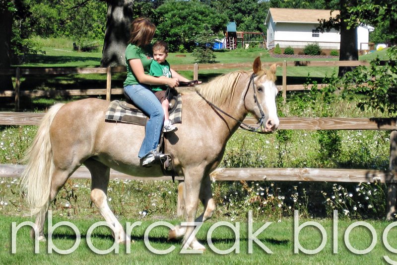 Porter was really unsure about her. She is intimidating, I’ll admit. He didn’t want to sit on her bareback but once I saddled her up and got on, he wanted to ride with me. He even let me trot her… riding with me and with me leading her.