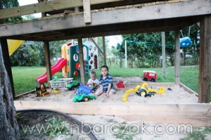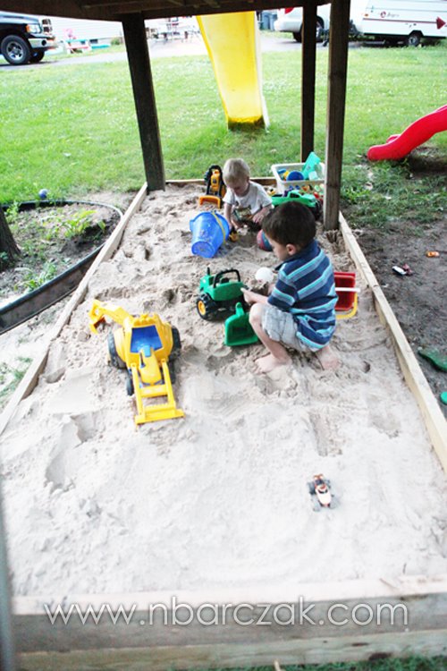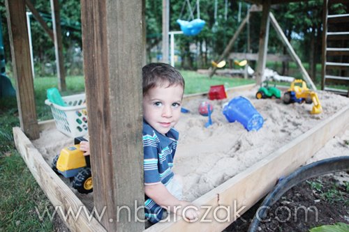 While Ryan was building the frame for the sand box I went and picked up a yard (aka… shitload!) of sand from the landscape place. We shoveled it all in and voila!