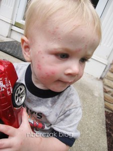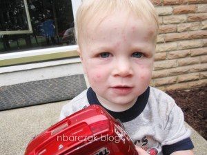 I took him into the doctor today and of course everyone who saw him exclaimed “What happened to his face!!” Dr. Williams said it looked like sand fleas… not sure if that was by process of elimination after hearing they had been playing in the sand box Saturday evening and he woke up Sunday morning with bites. I loved when she came back into the room with information on how to get rid of sand fleas and admitted that she went and googled it. Nice. I could have done that at home and saved myself $15. LOL!
