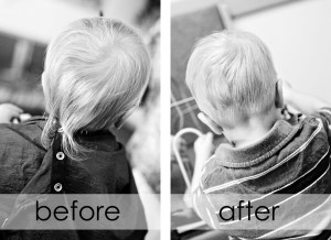 It needed to be done badly. As much as I’d love for my boys to have that cute, shaggy and slightly wavy hair, it just doesn’t seem to work. That or I just don’t have the patience. Hudson’s hair was growing in but not very thick. And it was mainly growing in the back… in the “rat tail” area. You know, like way back in elementary school when little boys would shave their heads except for that rat tail? Eww.