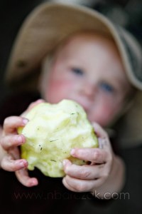 The other day I found out he likes to eat apples whole. Porter had left one on the coffee table and Hudson chowed it, skin and all. Today he wanted another one and oh boy… he kept dropping it everywhere and would get TICKED when I tried to take it away and wash it. Alright, have it your way…