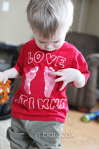 Hudson’s shirt he made at daycarew with Miss Marleen… it says “Love Stinks”.