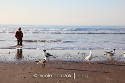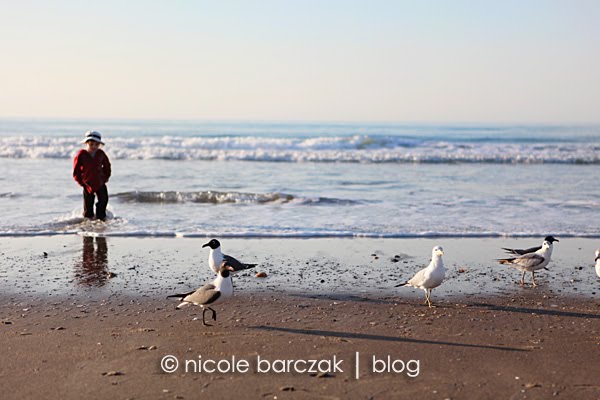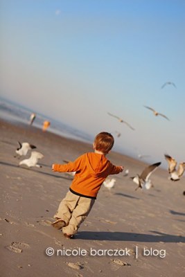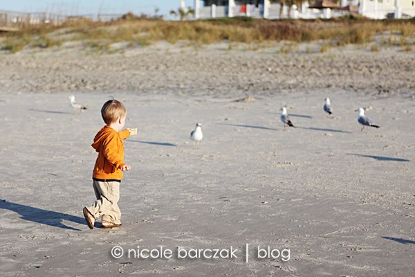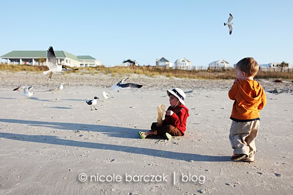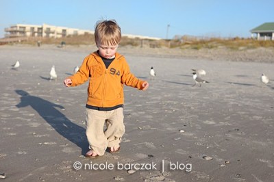 I had promised them I’d take them back to the beach to feed the gulls so that’s what we did.  My mom came with us and we grabbed some crackers and headed to the beach.  The boys love feeding the gulls. Mom told me yesterday that Hudson was walking around with a cracker in each hand, arms up in the air saying “Here!  Sea gulls.  Have.  a.  Cracker!  Eat. Cracker.  Sea Gulls!”  The whole time never letting go of his crackers. Today he did the same thing.  He ran around with his crackers in his hands but never threw them to the gulls.