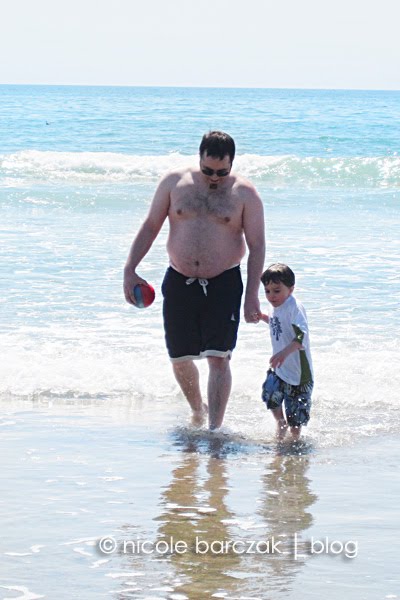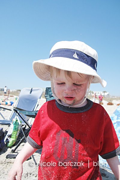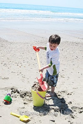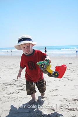 Back home, mom made breakfast for everyone while I went back to sleep. I was exhausted.  I finally got back up at 10am and we packed up to go to the beach for the afternoon.  The beach is so perfect to wear the kids out!  The boys did not stop all afternoon.  Hudson was happy as long as he had his dump truck and green shovel.  Porter loved splashing in the waves and running back and forth on the sand.  He made some friends with some kids near us on the beach.