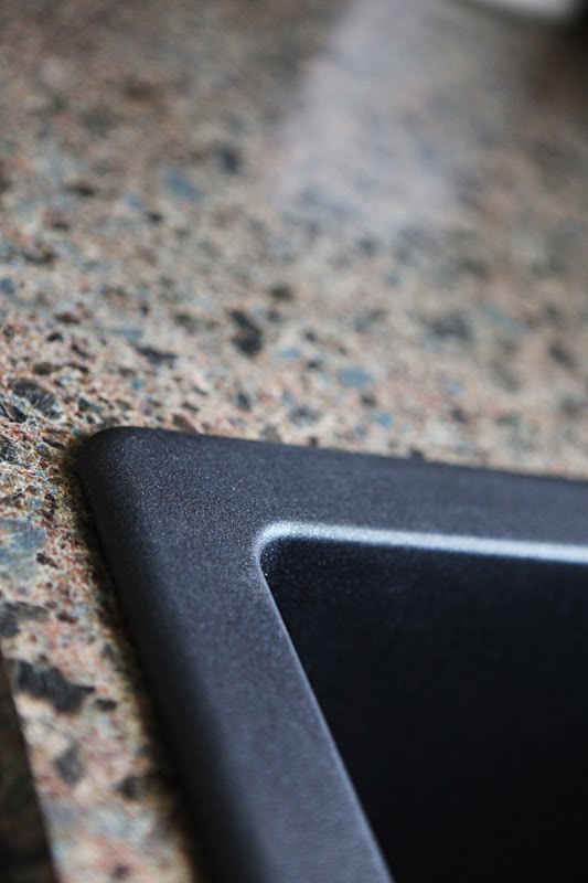 We had to get a new faucet for our new sink (SOOO happy to not have that white scratched and stained sink anymore!!).  The sink has two different sized basins and only room for a faucet in the center or to the right.  So we got a new faucet with a pull down sprayer and I love it.