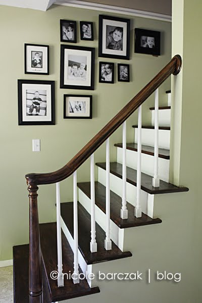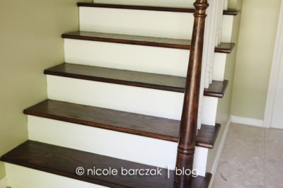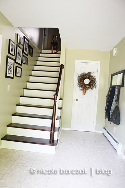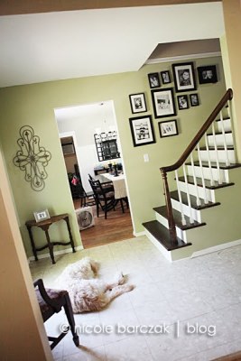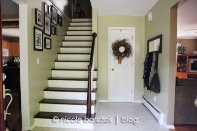 And here is our foyer now…. painted a neutral greenish color… stairs sanded and stained a dark walnut, and risers/railings painted. *sigh* soooo much better!