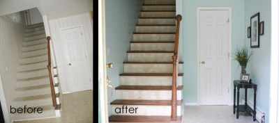 Here is our foyer when we moved in (on the Left) and then once I got to it…. ripped carpet off stairs, stripped wallpaper down, painted walls. Notice the stairs…. icky.