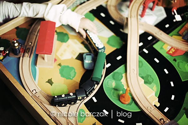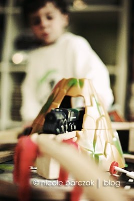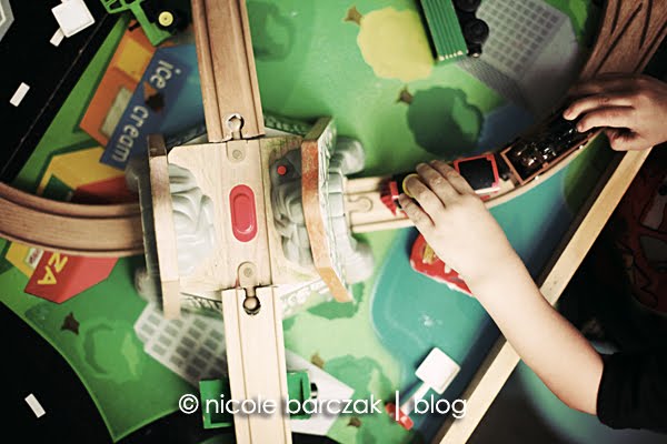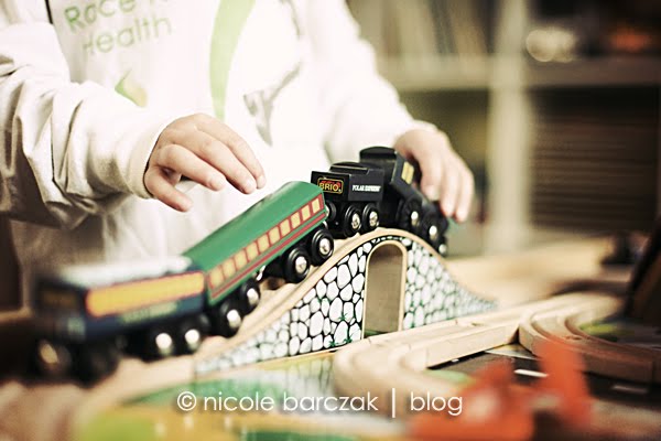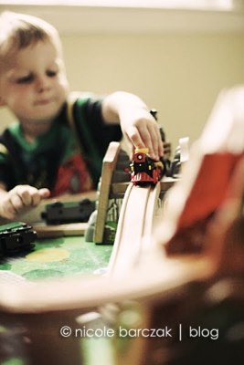 This evening I “played” trains with the boys. I love watching them pick out different trains and cars and driving them along the wooden tracks. Their tiny hands. The way they study the train moving. The sound effects they make.