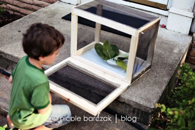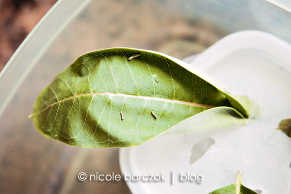 We had a playdate last week with some kids from Porter’s preschool and Deanna (Julianna’s mom) brought their monarch caterpillars they were raising. She had a simple little screened in cage that she kept them in and said it was easy to find the larva (caterpillars) on the milkweed. I guess I’d never tried looking! So, I decided we were going to start raising monarchs.