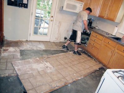 Then Ryan struck gold.  He got his chisel under the subfloor and the whole darn thing started to come up, tile and all!  We ended up ripping the floor up in about three 4’x8′ sections.  It was awesome.  We were done by 8:30pm!