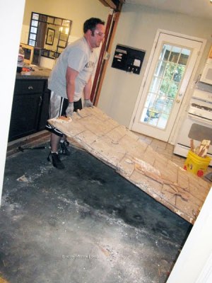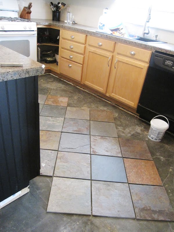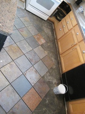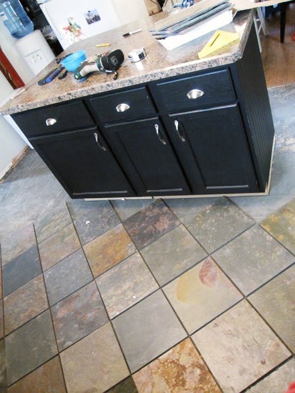 Of course, when Ryan got up and saw me laying out tile he was pissed.  I’ll cut the story short and just say that this night was not pretty around here.  He finally really got started on the floor at 7pm when his dad came over to help him and it is now 11pm and he’s just beginning to get the tile down.  I had to lay out the tile completely to get the pattern I wanted… slate varies so much that I wanted to make sure the colors and variations flowed well. We got a multi-colored slate, and it really pulls in the maple from the cabinets as well as the greys/blacks from the countertop and island.  I can’t wait to see it finished!