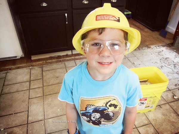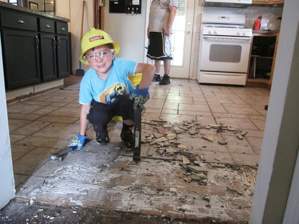 We started chipping away at the tile around 5:30pm.  Porter was SO into helping.  He was cracking both of us up… he was more motivated than the two of us combined to get things going.  He wanted to be right in there chipping away.  We finally decided to call Ryan’s dad to come pick the boys up because, bless his heart, Porter was so willing to help he was getting in the way.  Dave picked the boys up around 6:30 or so and at that point we were thinking it’d be 1am before we’d get this floor done.