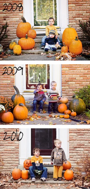 The first year we moved here we started this tradition of pictures on the front porch.  And I love seeing how the boys have grown each year!  (and how our pumpkins have shrunk… and this year our display was pretty puny…).