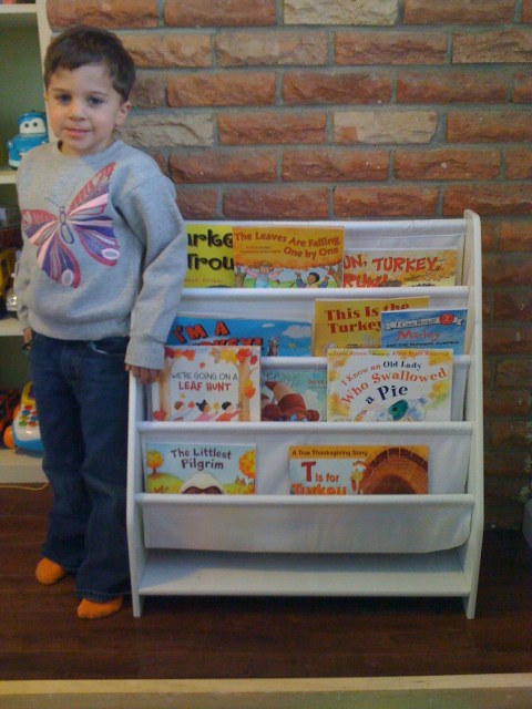 I decided to move ALL of the books up to the boys’ rooms and take Hudson’s white forward-facing bookshelf and put that in the playroom for seasonal/holiday books. I think this will give the boys more of a variety of bedtime/naptime books in their room (we always read a book or two at naptime and bedtime), and it will limit books being scattered around the playroom. And hopefully, the holiday and seasonal books will get read more often.